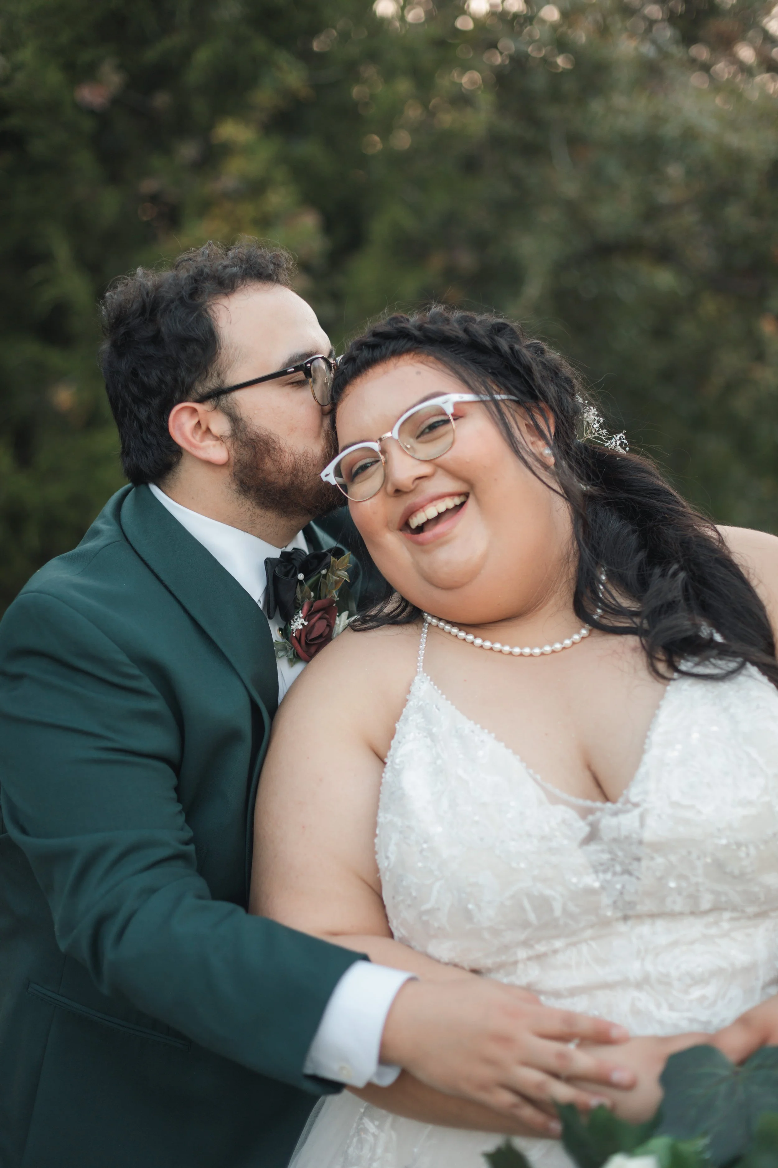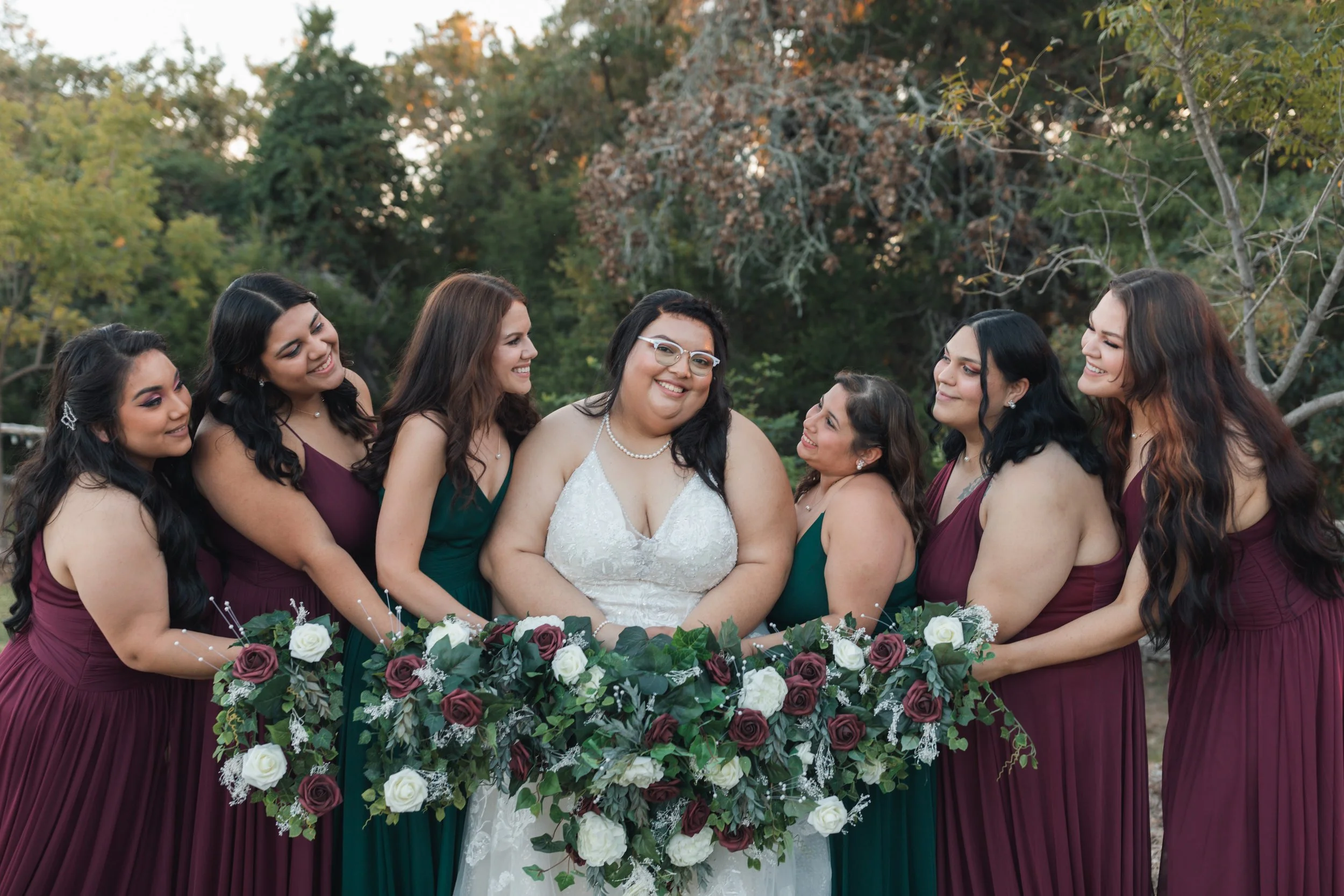 The couple wanted to keep the ceremony short and sweet because they couldn’t wait to be married! They chose one of their 7th grade teachers, ED Wetterman, to officiate. He had taught them Texas History and held a special place in their hearts as their favorite teacher. For the reception, they decided to go with a modern glam theme, focusing on wine/burgundy, hunter/emerald green, and lots of gold accents. They spent most of the evening dancing with friends and family, eating good food and even better cake! The couple felt that the first dance was magical but what was even better, was the private last dance they had after the reception hall was cleared out at the end of the night. It was a moment for them to not only escape but to just take in the entire night alone as husband and wife.
